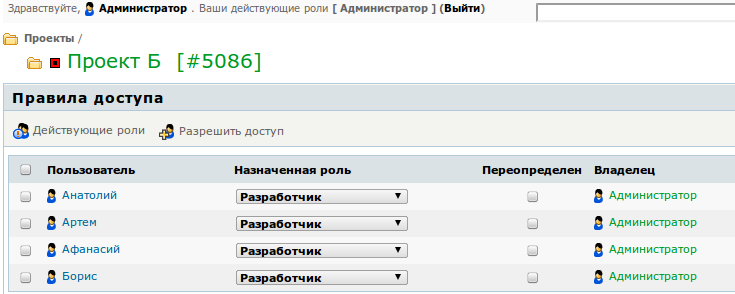Теперь, для того, чтобы дать команде "Альфа" доступ на "Проект А" нужно: