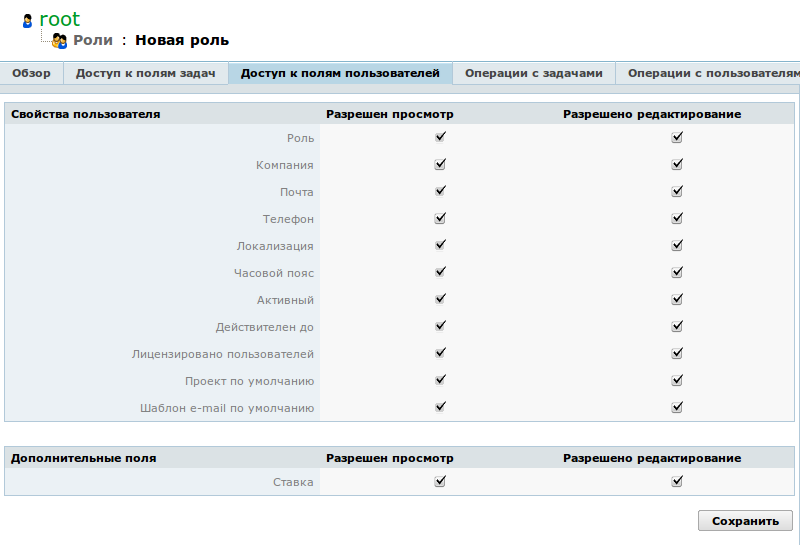 Вы можете управлять видимостью и редактированием дополнительных полей, привязанных к пользователям. Настройки каждого из правил представлены в виде таблицы с опциями "Разрешен просмотр" и "Разрешено редактирование".